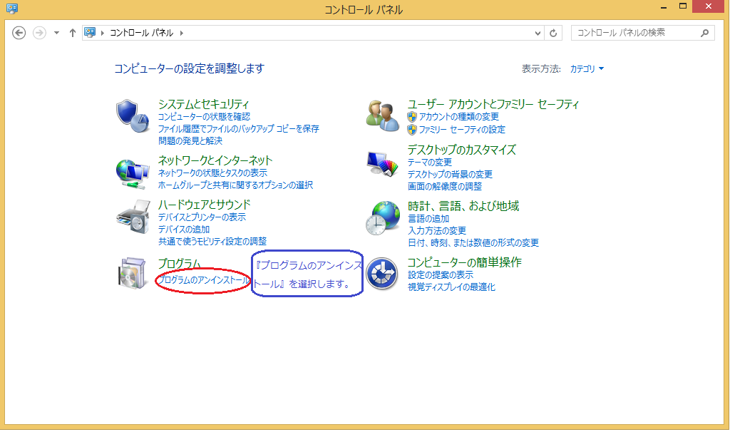 | 64bit版でしたら、先ず、Word(Office)をアンインストール(削除)して、32bit版でインストールしなおします。 @コントロールパネルを開きます。 A【プログラムのアンストール】をクリックします。 WindowsVista,7の場合は、【スタートメニュー】から、windows8の場合は、右上端か、右下端にポインタを移動させるとメニューが開きます。歯車のアイコン【設定】をクリックするとコントロールパネルを選択できます。 |